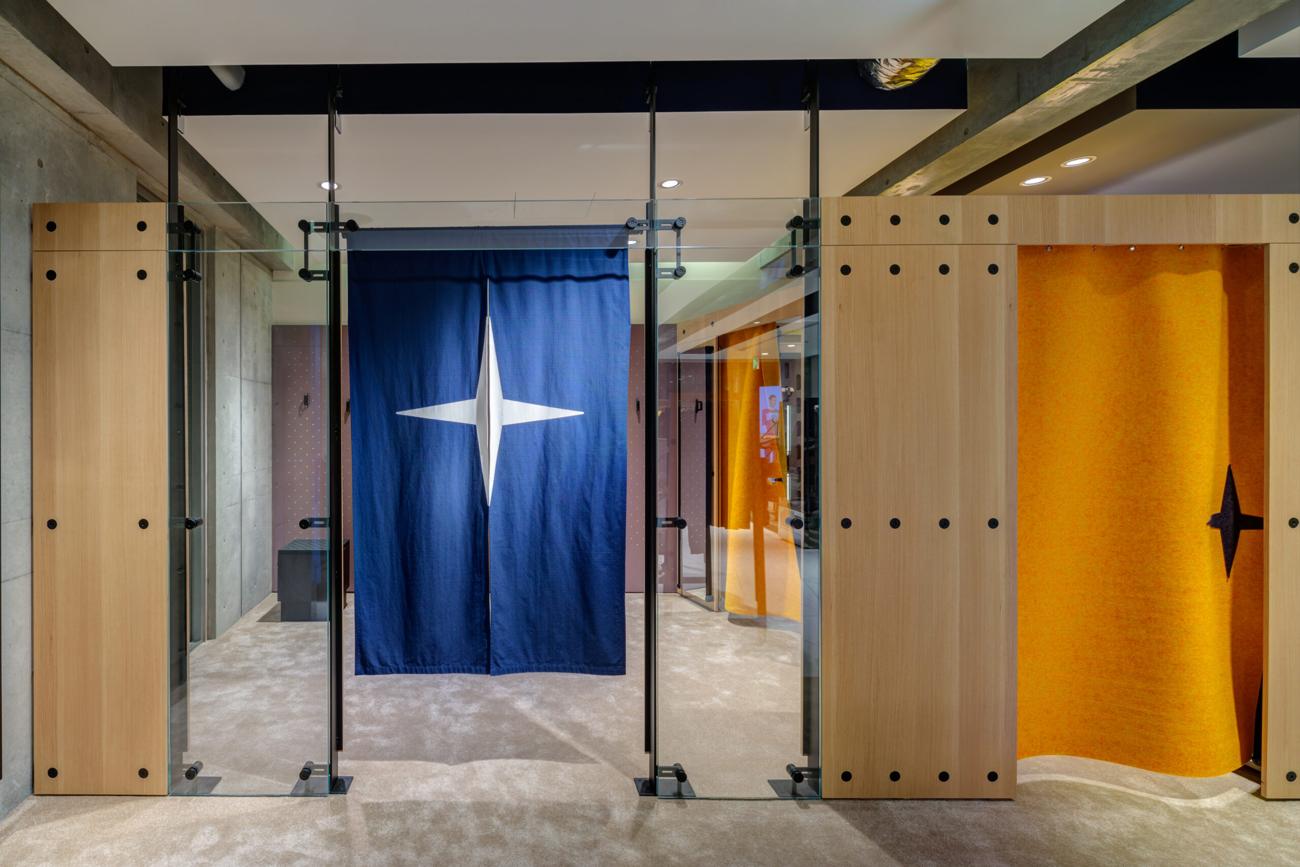 店内はコンクリートとガラスを基調とし、石床のビシャン仕上げやフィッティングルームののれんなど、日本文化を取り入れた上品な雰囲気です。内装資材や店舗什器関係は本国イタリアからの支給品を多数取り入れ、商品を冷蔵できる什器の中に温度で色が変わるアイスジャケットを飾るなど、店舗の商材を「見せる」ことに工夫を施しています。